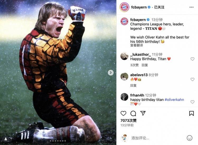 拜仁社媒写道:欧冠功勋、精神领袖、不朽传奇——泰坦(卡恩的绰号) 🔴⚪️ 恭祝卡恩56岁生日快乐!🥳
